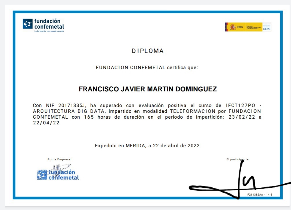 En estos momentos recibo mi certificación actualizada para poder ayudar a nuestros clientes en su proceso de digitalización y big data.