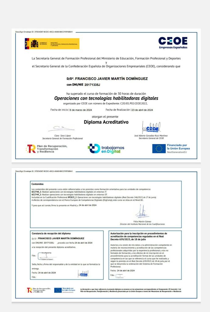 Recientemente, he tenido el privilegio de completar un curso de Operaciones con Tecnologías Habilitadoras Digitales, impartido por la Confederación Española de Organizaciones Empresariales (CEOE). Este curso ha sido una experiencia invaluable que ha ampliado mi comprensión y habilidades en el campo de la digitalización empresarial.