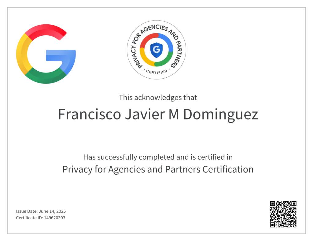 En rmj22.com nos alegra compartir que hemos obtenido la Google Privacy for Agencies and Partners Certification, una acreditación clave en la era digital que garantiza que trabajamos con las mejores prácticas en materia de privacidad, transparencia y responsabilidad de datos.