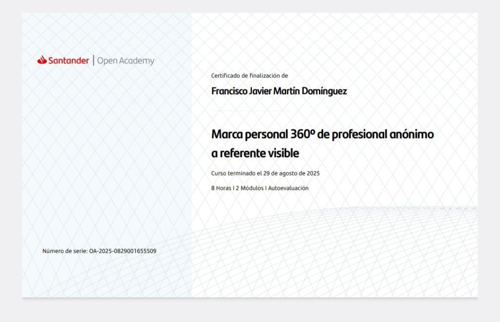 Hace unos días finalicé el curso Marca Personal 360°: de profesional anónimo a referente visual, impartido en Santander OPEN Academy. Esta experiencia me ha dado nuevas herramientas para acompañar a mis clientes en el camino de su posicionamiento y construcción de marca personal, desde una perspectiva estratégica y con un enfoque práctico en el mundo digital.